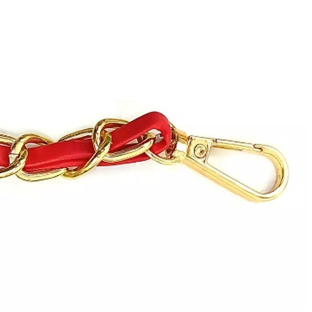 Tamanho: comprimento: 1,20m. Mosquetão:30mm x 15mm. Interno: 18mm x 10mm. Composição: 60% metal/ 40% couro ecológico.
