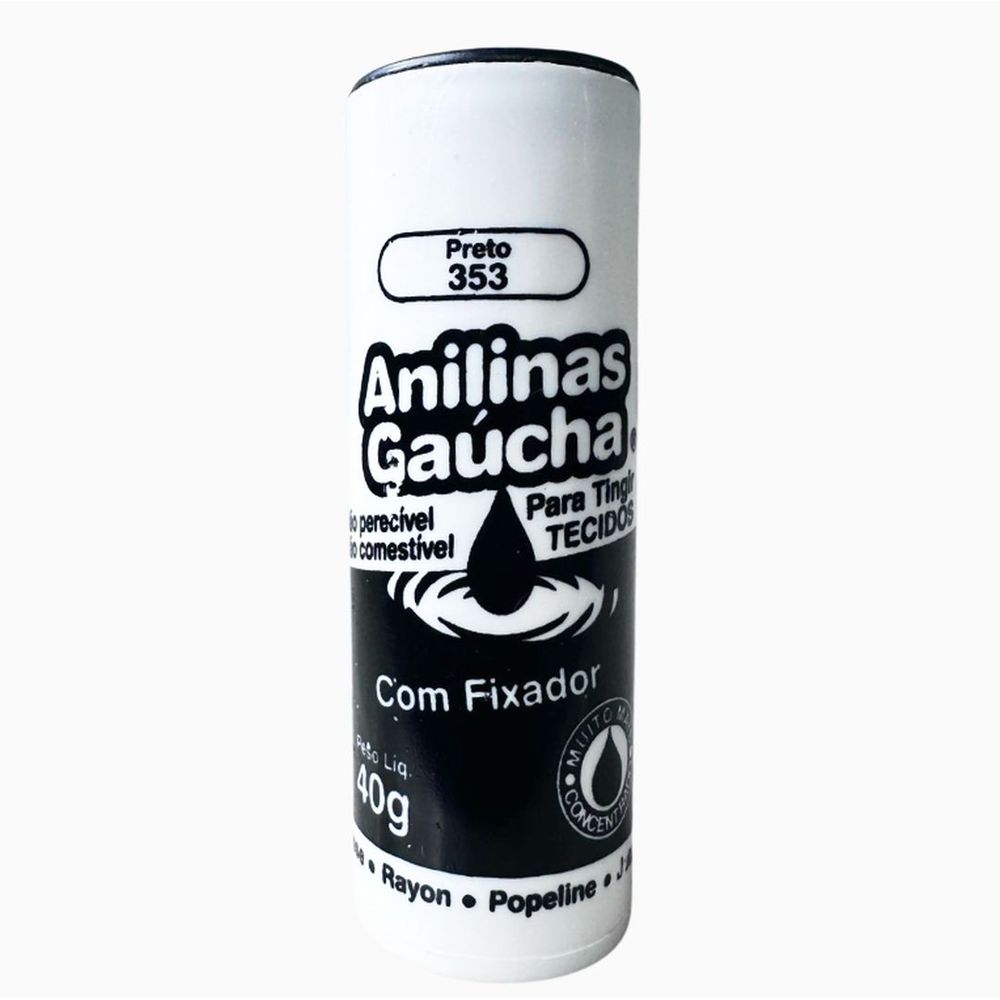Anilinas gaúcha | contém: 40 gramas | com fixador, para tingir tecidos, não perecíel, não comestível. | idicado para algodão, viscose, rayon, popeline, juta, linho e sisal. | modo de usar: 1 - use 1 tubo de anilina para uma camiseta, 2 tubos para uma calça e 3 tubos para um casaco. 2 - dissolva a anilina em 1 litro deágua quente em outro recipiente, coloqueágua fria até cobrir o tecido e leve aofogo. Quando aquecer adicione a anilinajá diluida e mexa lentamente por 40 minutos. | composição: corante e sulfato desódio.