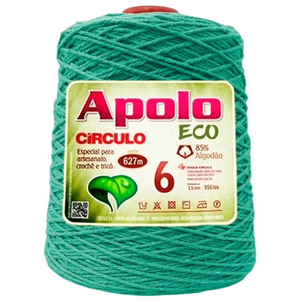 Barbante apolo eco circulo n.06. Contém:600 gramas = 627 metros. Composição: 85% algodão e 15 outras fibras tex 956. Agulha recomendada: crochê - 3,5mm a 4,5 mm | tricô - 4,5mm.