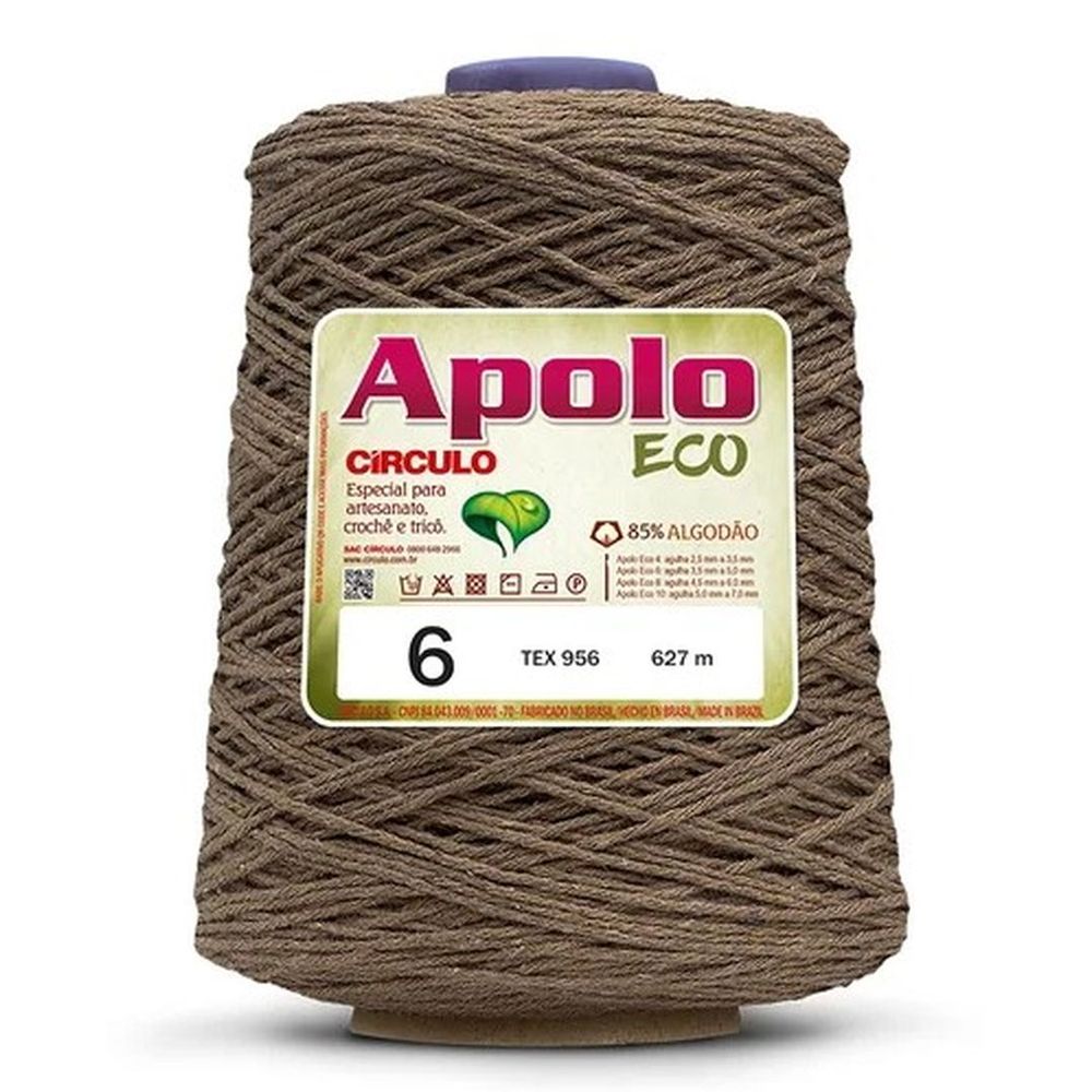 Barbante apolo eco circulo n.06. Contém:600 gramas = 627 metros. Composição: 85% algodão e 15 outras fibras tex 956. Agulha recomendada: crochê - 3,5mm a 4,5 mm | tricô - 4,5mm.
