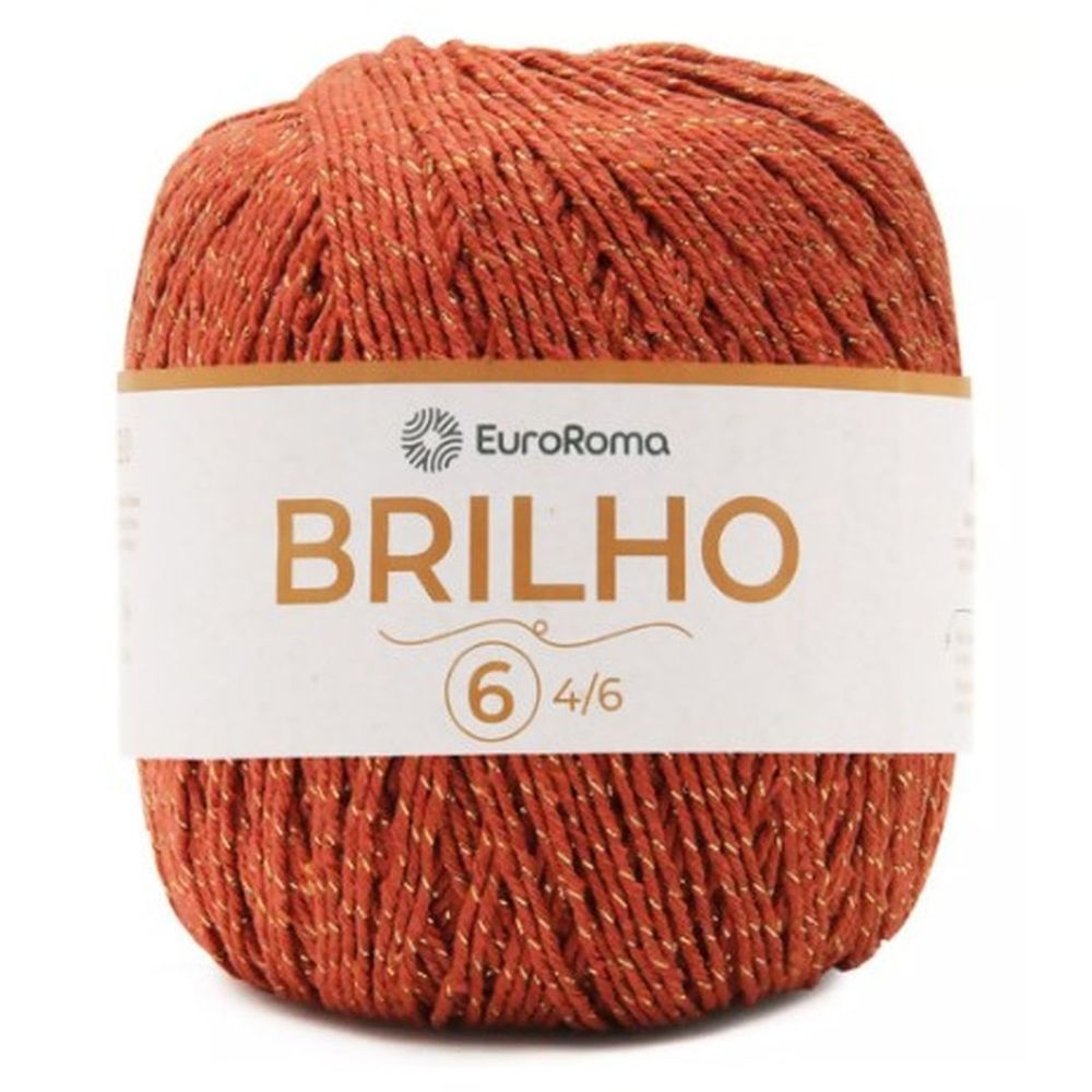 Barbante euroroma brilho ouro tex 984. Contém: 1 unidade com 400 gramas = 406 metros. Espessura: 4x6 composição: 85% algodão e 15% outras fibras. Agulha recomendada: crochê - 3,5mm | tricô - 4,5mm.
