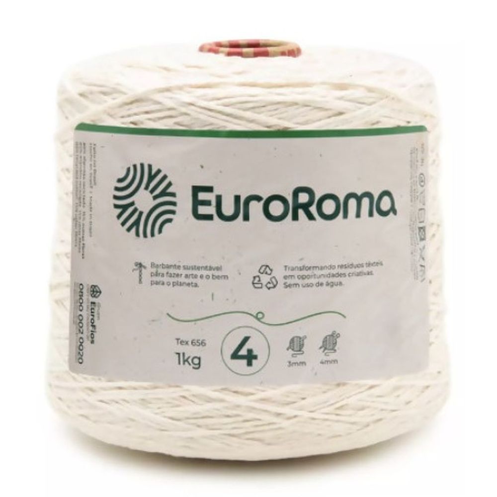 Barbante euroroma cru 4/4 cone com 1kg tex 656. Espessura:4/4 peso: 1 kg. Composição: 85% algodão e 15% outras fibras.