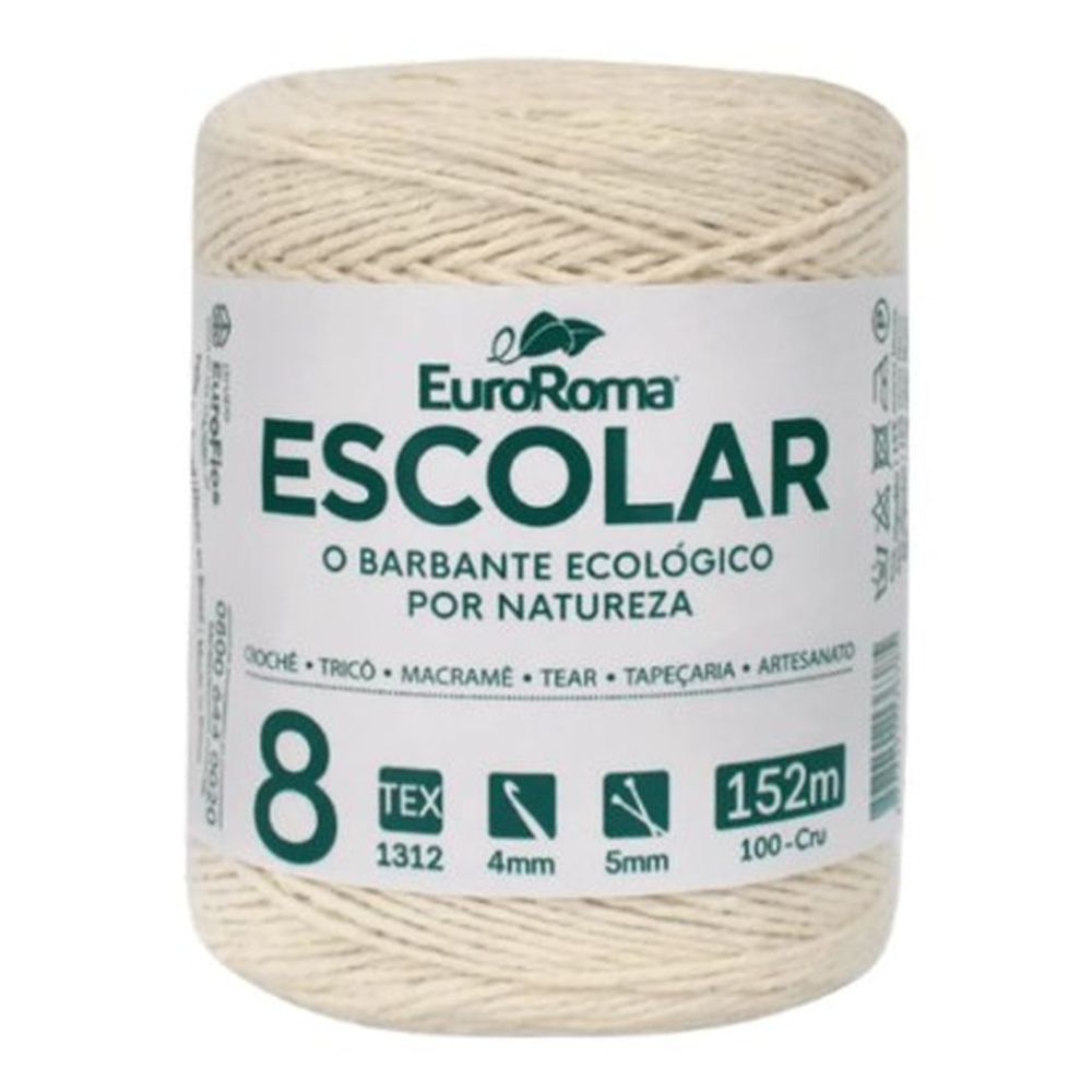 Barbante euroroma escolar 4/6. Peso: 200g. Metragem: 101m. Espessura: nº 6. Composição: 85% algodão reciclado e 15% outras fibras. Sugestão de agulhas: crochê:3,5mm | tricô: 4,5mm