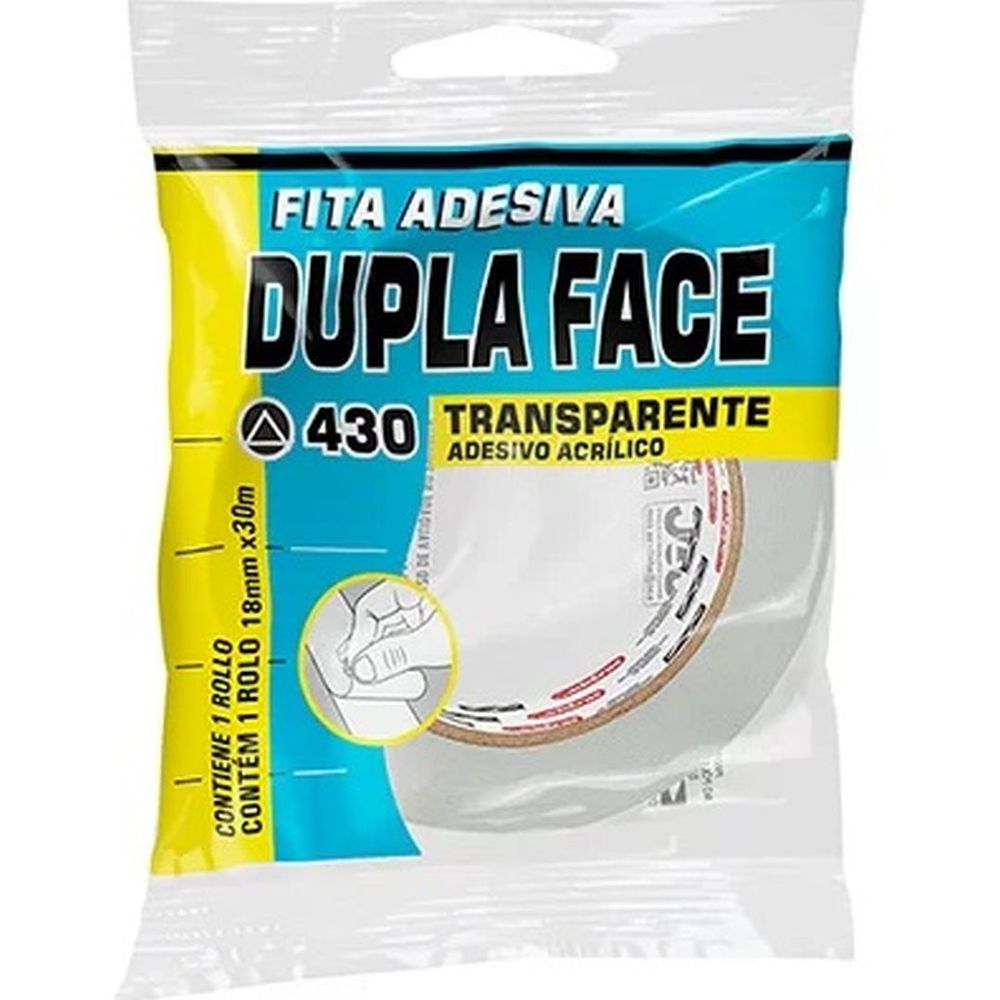 Fita dupla face ref.430 transparente acrílico aldebras. Dimensões: 18mmx30m. Contém: 1 rolo. Ideal para uso de fixação de cartazes, enfeites ou arranjos, montagens, uso geral em decoração.