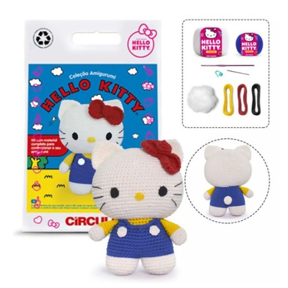 Kit amigurumi coleção hello kitty. Contém: novelos e meadas de fio amigurumi; agulha de crochê 2,5 mm; agulha de tapeçaria nº 16; fibra para enchimento (40 g); marcador de ponto cadeado; cartela deadesivos; tag personalizada.