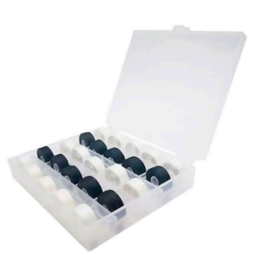 Box com linhas sem bobinas ("boninas descartáveis"). Tamanho: 20x8mm (bobina). Composição: 100% poliester lubrificada. Contém: 25 unidades de bobinas e 1 box para armazenamento.