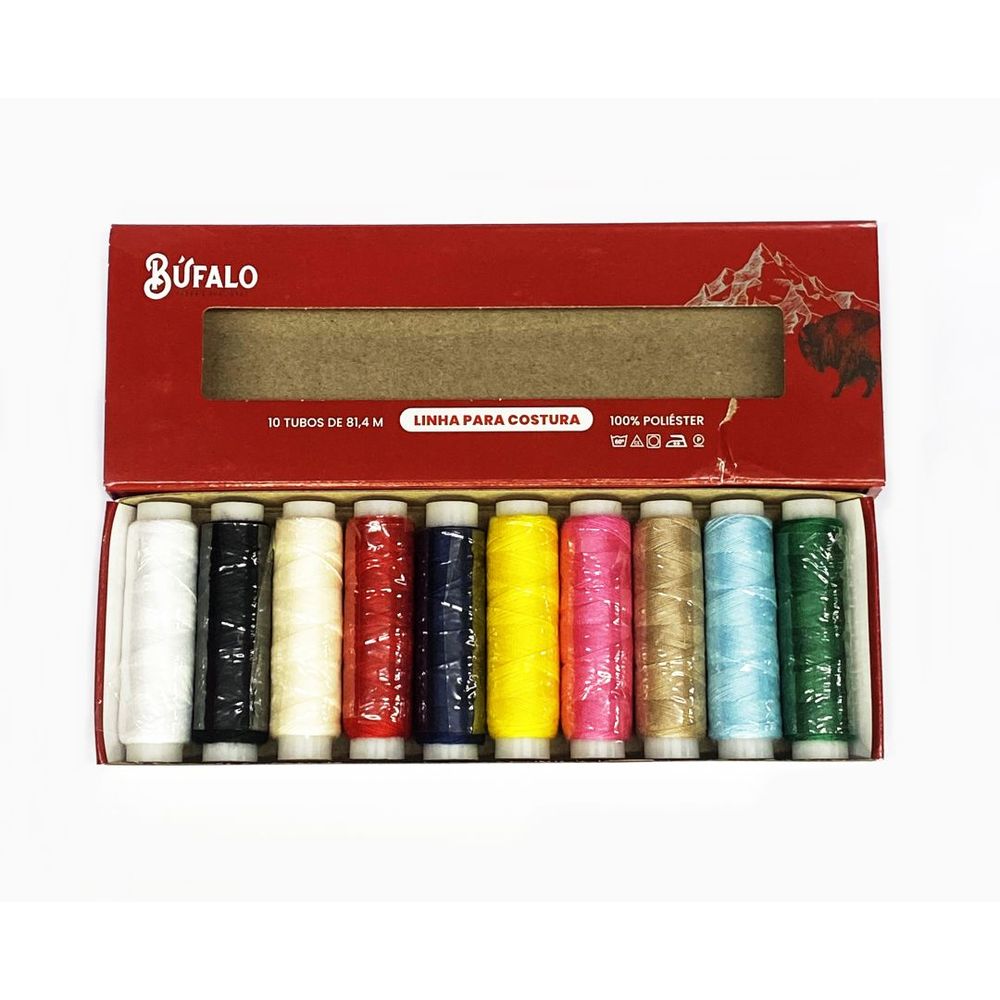 Linha p/costura 100jds. Contém: 10 unidades com 81,4 metros. Composição: 100% poliéster.