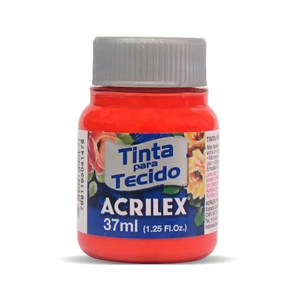 Tinta acrilex para tecido fosca. Contém:1 unidade com 37ml. Apresentada em vários tons de cores foscas, não tóxica. Muito resistente a lavagens. Pode ser aplicada com pincel, esponja ou carimbo, em tecidos de algodão sem goma, não sintéticos. Lavar o tecido antes da pintura, para retirar os resíduos de goma. Após a pintura, aguarde 72 horas para lavagem.