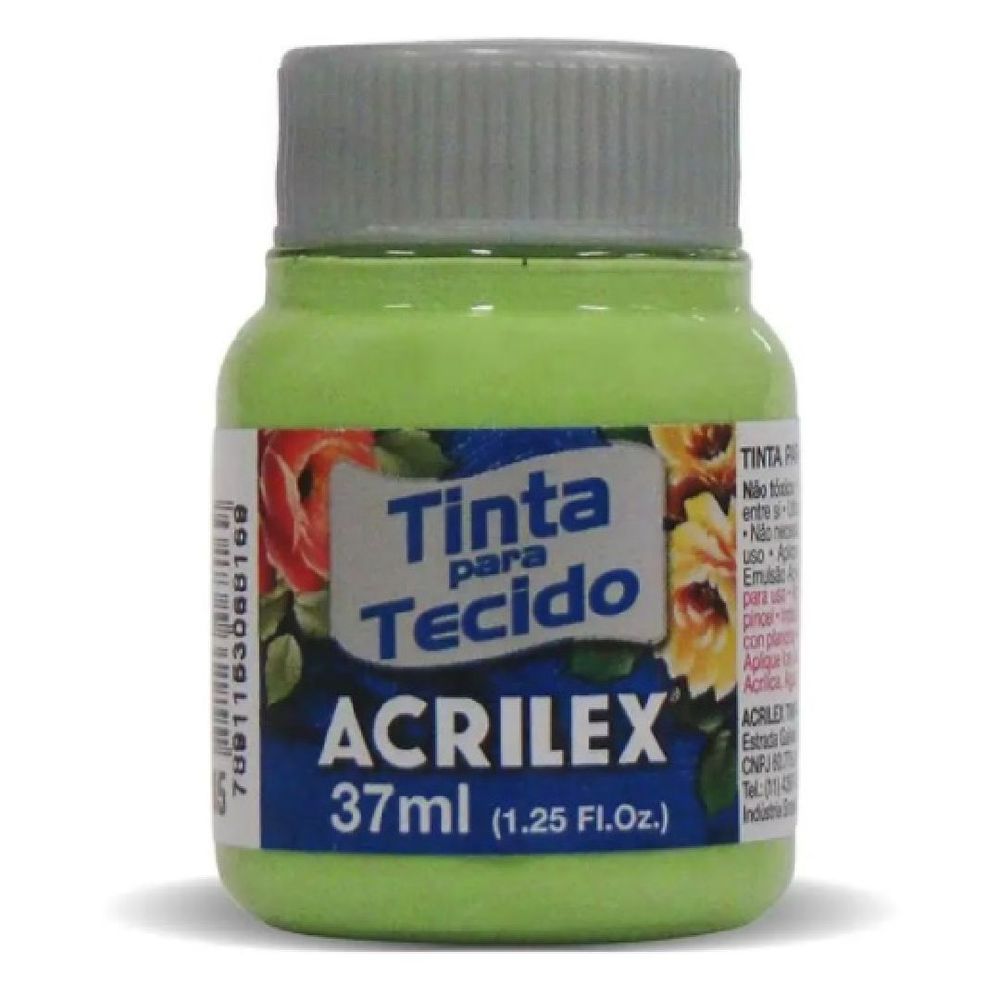 Tinta acrilex para tecido fosca. Contém:1 unidade com 37ml. Apresentada em vários tons de cores foscas, não tóxica. Muito resistente a lavagens. Pode ser aplicada com pincel, esponja ou carimbo, em tecidos de algodão sem goma, não sintéticos. Lavar o tecido antes da pintura, para retirar os resíduos de goma. Após a pintura, aguarde 72 horas para lavagem.