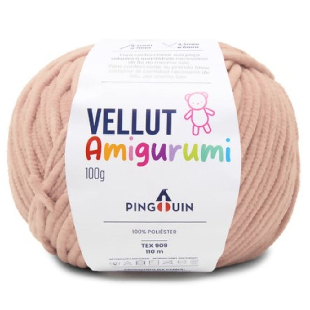 Vellut amigurumi tex 909. Contém: 100g/110mt. Composição 100% poliéster. Agulhacrochê 4,5mm - 7mm. Agulha tricô 4,5mm -6mm.
